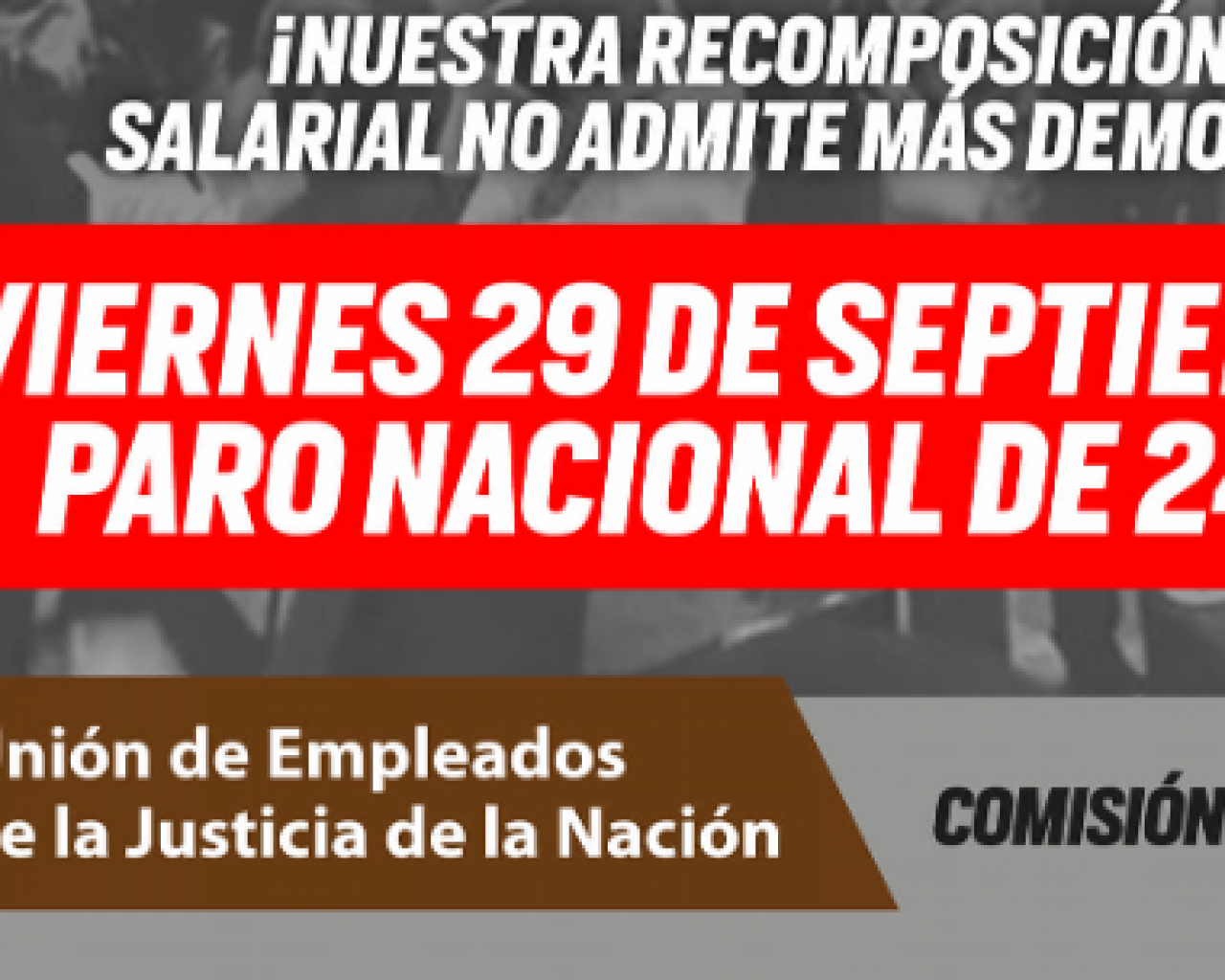 La Unión de Empleados de la Justicia de la Nación (UEJN), que lidera Julio Piumato, se concentró frente a la Corte Suprema de Justicia de la Nación Argentina para realizar un "banderazo nacional" en reclamo de "una recomposición salarial no admite demoras" y advirtieron que, en caso de no tener respuesta a su demanda, este viernes realizarán un paro de 24 horas. “¡Nos deben agosto, se acaba setiembre. La inflación golpea!”, dijo Piumato sobre el pago del último aumento acordado con el máximo tribunal.