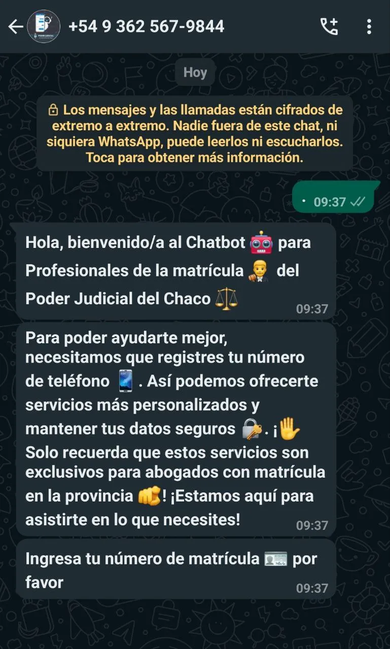 El servicio, aprobado por resolución 637/24 del Superior Tribunal de Justicia provincial y presentado por la Dirección de Tecnologías de la Información, esta disponible mediante el número de teléfono +5493625679844 las 24 horas del día y los siete días de la semana.