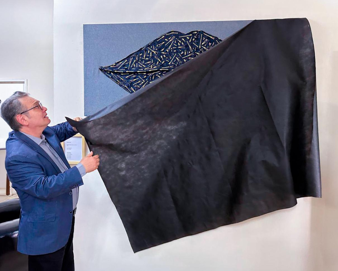 La instalación en forma de cuadro simboliza el silencio forzado y la complicidad de los testaferros en la pirámide de corrupción económica. Cada cierre en la boca representa una barrera que impide la revelación de la verdad, reflejando cómo la Justicia tiene que superar los obstáculos probatorios del silencio y la inacción.